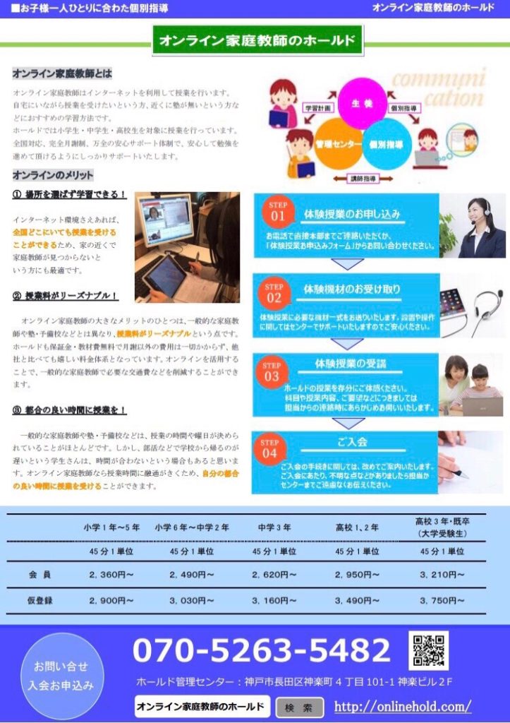 ホールドでは小学生・中学生・高校生を対象に授業を行っています。全国対応、完全月額制、万全の安心サポート体制で、安心して勉強を進めて頂けるようにしっかりサポートいたします。